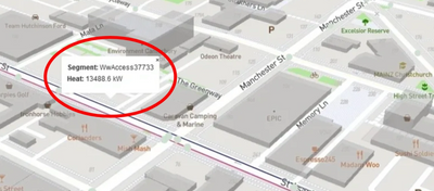 This will open a pop-up window which will show two lines of text. The top line is the infrastructure reference for that pipe in the network. The bottom line is the amount of heating and/or cooling available in that pipe in the network.